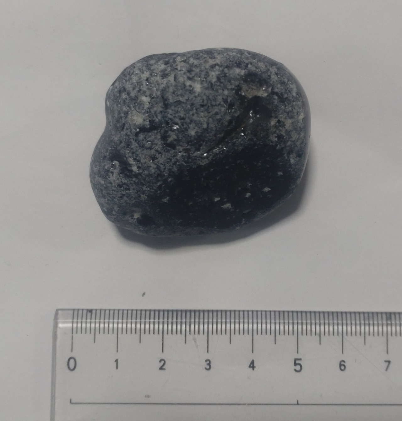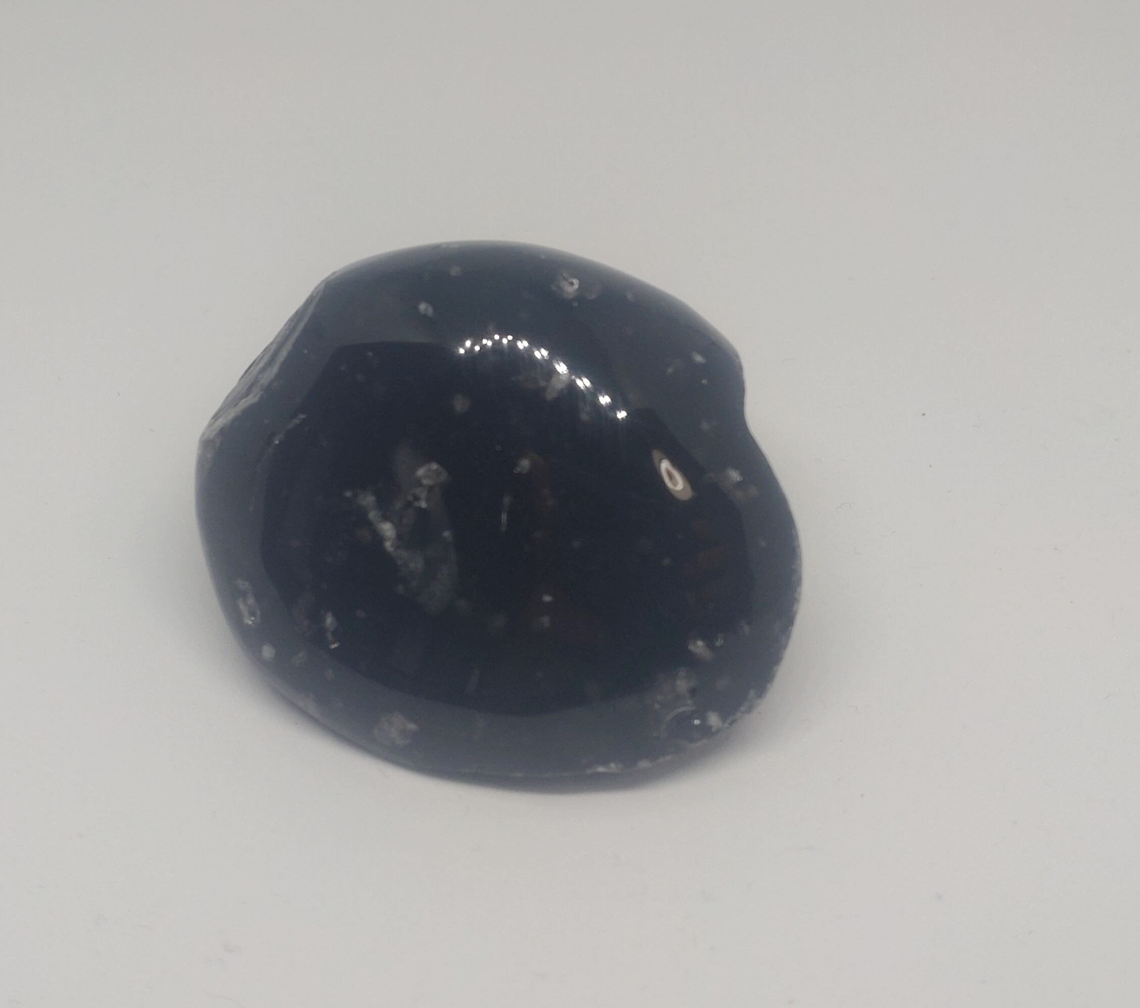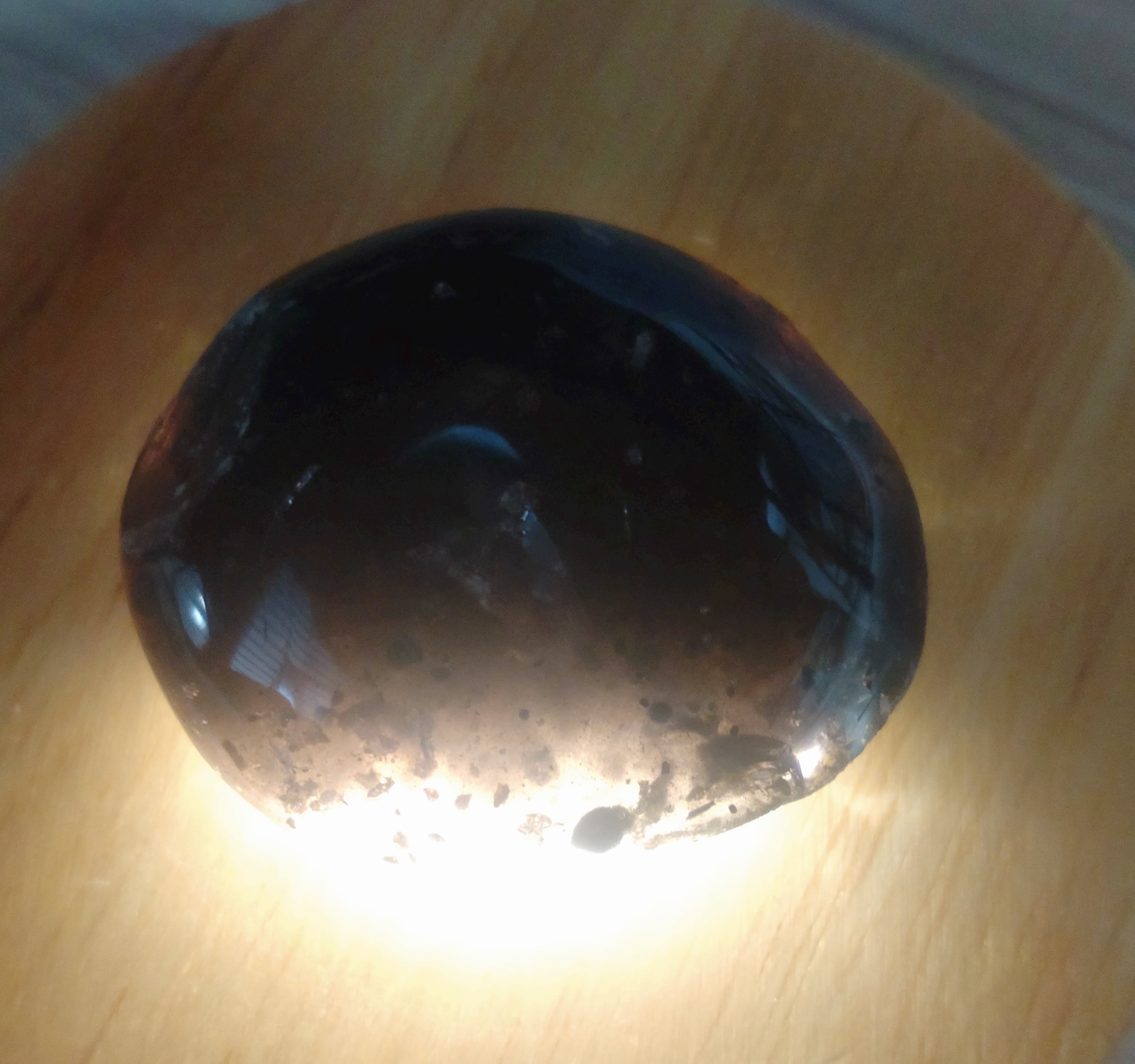 この石は、島内の海岸に漂着していたもので、石の形をなるべく変えずに一部を磨きました。またこの個体は透明度が比較的高く、下からライトを当てると透過し、宇宙空間のような内包物を見ることができます。